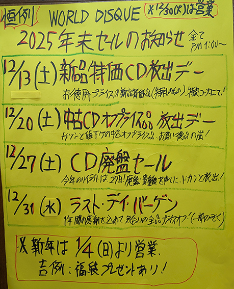 【WORLD DISQUE 2025年末セールのお知らせ (全てPM1:00〜)】 |
